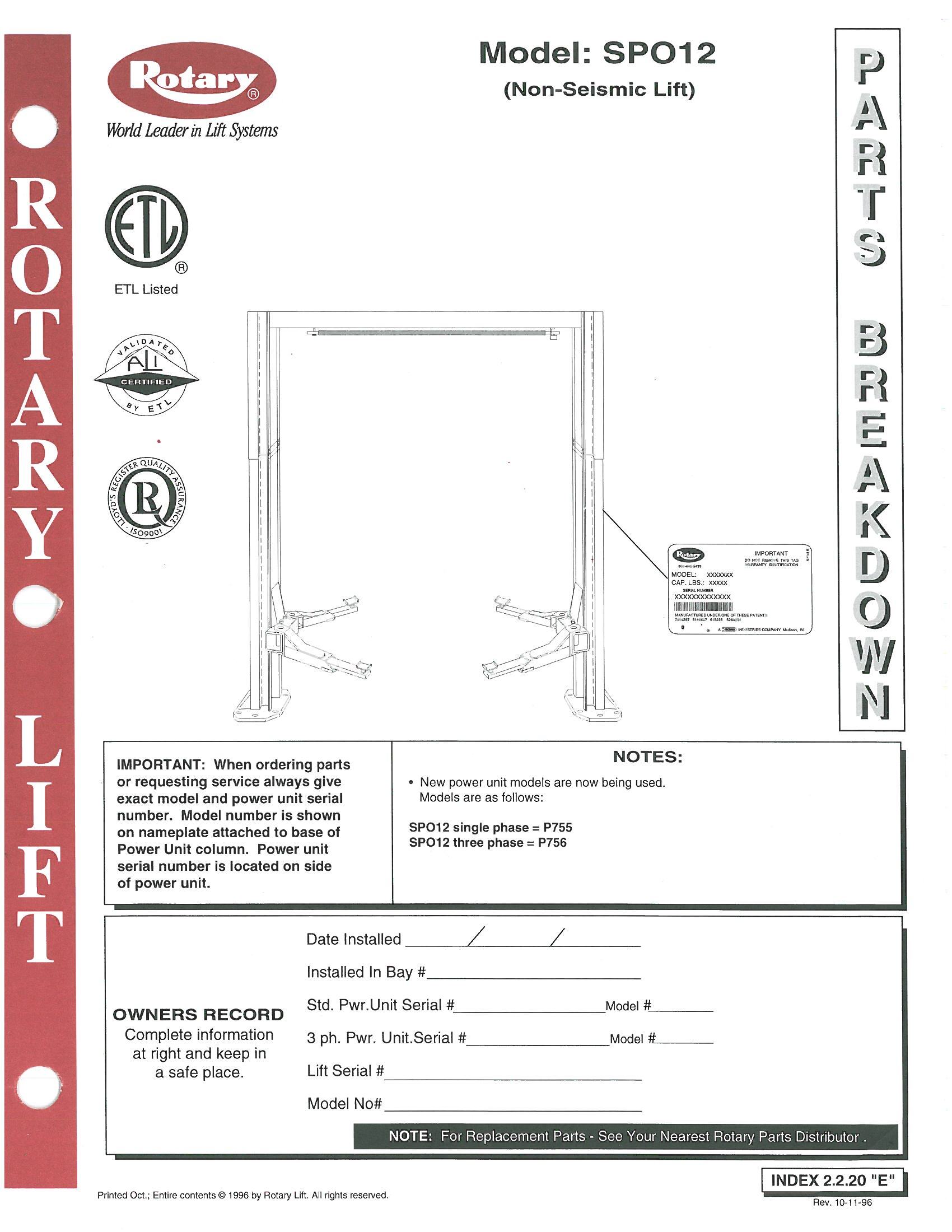 Rotary Lift - Service Parts